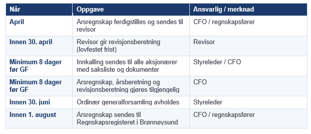 Generalforsamlingen er aksjonærenes øverste myndighet i selskapet, og det er styret og daglig leder som er ansvarlige for å forberede og gjennomføre den. Men CFO spiller en nøkkelrolle i å sikre at det finansielle grunnlaget er på plass og korrekt presentert.