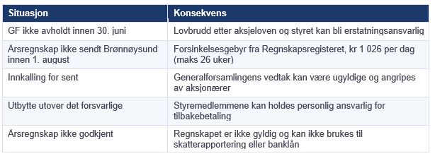 HUSK: Vurder å avholde generalforsamlingen i mai eller tidlig juni, ikke vent til siste uke av juni. Det gir handlingsrom hvis noe uventet dukker opp, og gir revisor og styre bedre tid til forberedelse.